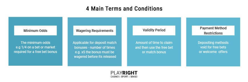 Along with minimum odds, you�ll also find wagering requirements. These apply to deposit match bonuses rather than free bets, and stipulate a minimum number of times you need to playthrough, or wager, the bonus (and sometimes deposit), before you can withdraw from the bonus.